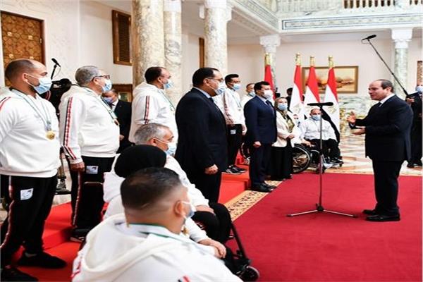 استقبل الرئيس عبدالفتاح السيسي، الخميس، اللاعبين واللاعبات والأطقم التدريبية المتوجة بميداليات خلال دورة الألعاب البارالمبية الأخيرة في طوكيو 2020، بحضور الدكتور مصطفى مدبولي، رئيس مجلس الوزراء، والدكتور أشرف صبحي، وزير الشباب والرياضة، وحياة محمد خطاب، رئيس مجلس إدارة اللجنة البارالمبية.