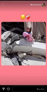 ونشرت جورجينا صورة لفتاة فلسطينية صغيرة وهي تجلس تمسك دميتها في يدها على أطلال أحد المباني المحطمة بفعل القصف الإسرائيلي في غزة.