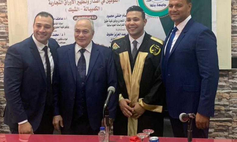 وتضمت لجنة المناقشة، الأستاذ الدكتور عصام حنفى محمود، أستاذ القانون التجاري ووكيل كلية حقوق جامعة بنها للدراسات العليا سابقا “رئيسا ومشرفا” والأستاذ الدكتور عاطف محمد الفقي، أستاذ القانون التجاري، ووكيل كلية الحقوق جامعة المنوفية “عضواً”، والأستاذة الدكتورة حنان عبد العزيز مخلوف، أستاذ القانون التجاري، بكلية الحقوق جامعة بنها “مشرفا وعضوا”، والأستاذ الدكتور محمد فوزي، لواء دكتور الحرس الجمهوري مدرس أكاديمية الشرطة “عضوا”.